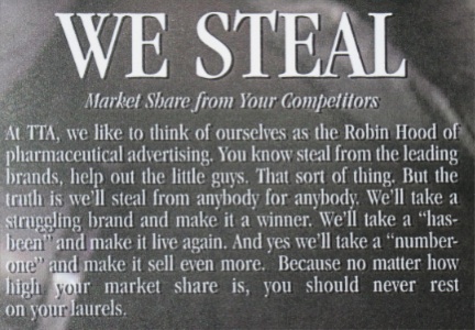 TTA was a Philly-based agency with 40 years of equity in the area, but little to no awareness nationally—even in the Pharma world. We needed to disrupt the status quo and make some noise in the trade magazines. This bait and switch copy approach was designed to maximize the shock factor. Unfortunately, it never actually ran because certiain partners preferred a more conservative approach, but it's still one of my favorite dead campaigns. I was still cutting my teeth at the time, but remain proud of it. Just wish the artist, who is generally brilliant, did not run the text directly over the picture in knockout type. If you can't read it, here it is big as day...
